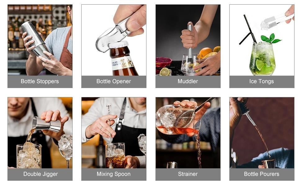 14 Pieces Boston Shaker Set: This 14 pieces Boston shaker set has everything Mixology kit you need to make craft drinks. It includes 2-piece Boston Shaker Tins (Select Available Shaker Volume: 23.7 oz (700ML) / 20.3 oz (600ML), 20.3oz (600ML) / 15.2 oz (450ML)), 1 Double Jigger ( 1/2 oz - 1 oz), 1 Double Jigger (2/3 oz - 4/3 oz), 1 Strainer, 1 Ice Tongs, 4 Liquor Pourers, 1 Bottle Opener, 1 Muddler, 1 Bar Spoon, 1 Corkscrew.